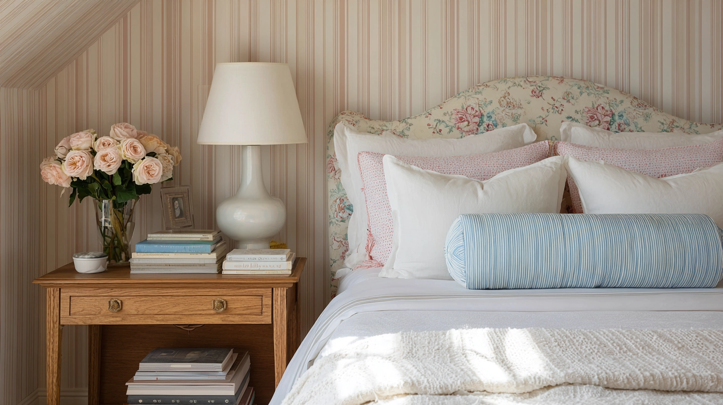 A delightful blend of textures defines this Nancy Meyers-inspired bedroom. The soft blue floral pillows and striped bolster bring elegance and comfort, while the light wooden nightstand complements the neutral backdrop. Fresh white flowers add a lively touch to the cozy ambiance.
