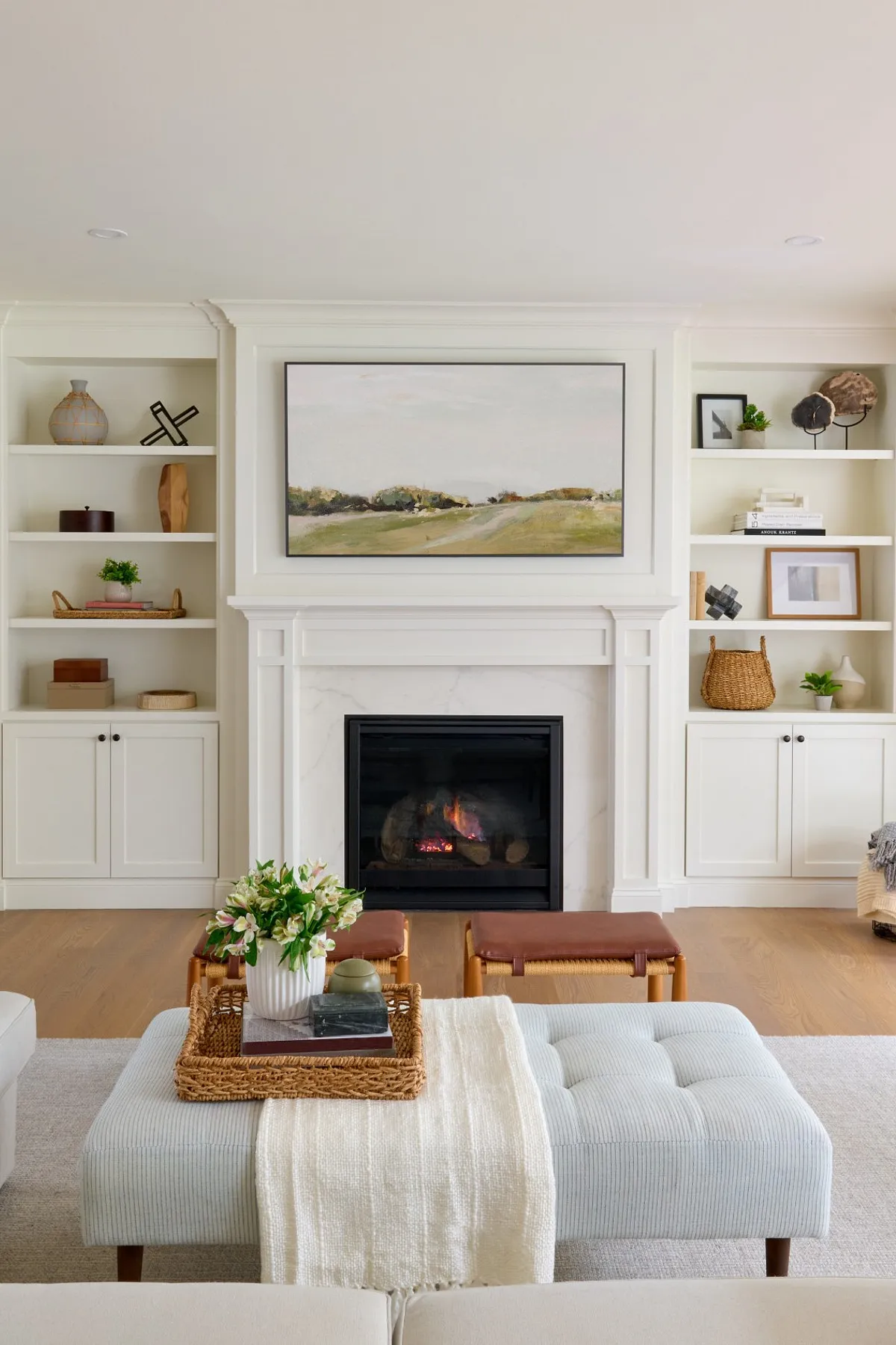 Woven baskets, rattan furniture, or a seagrass rug add warmth and a grounded element to the room. Pair these with crisp upholstery to balance the look.