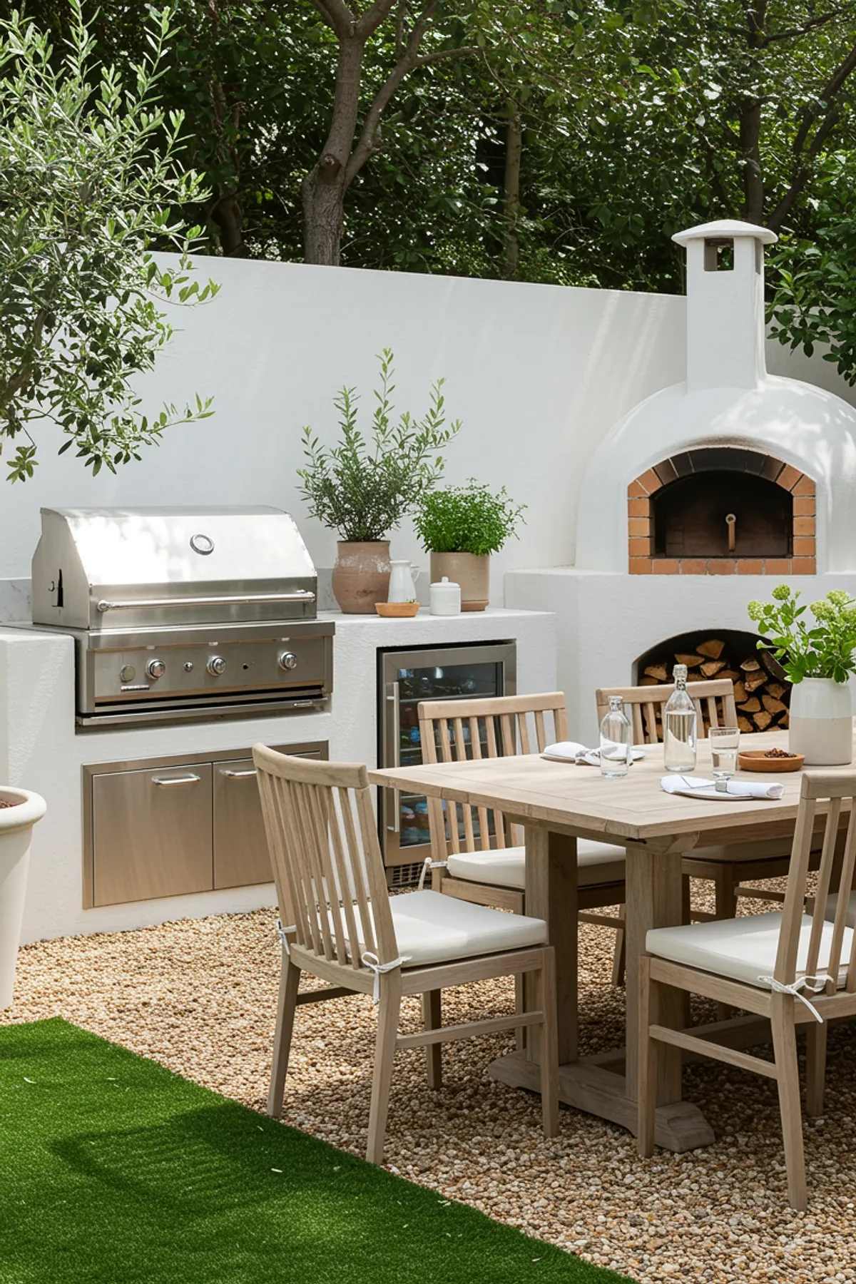 This outdoor kitchen is all about essentials, featuring a grill and rustic wood-fired oven. The combination of stone textures and greenery creates a backdrop that’s perfect for casual dining or festive gatherings.