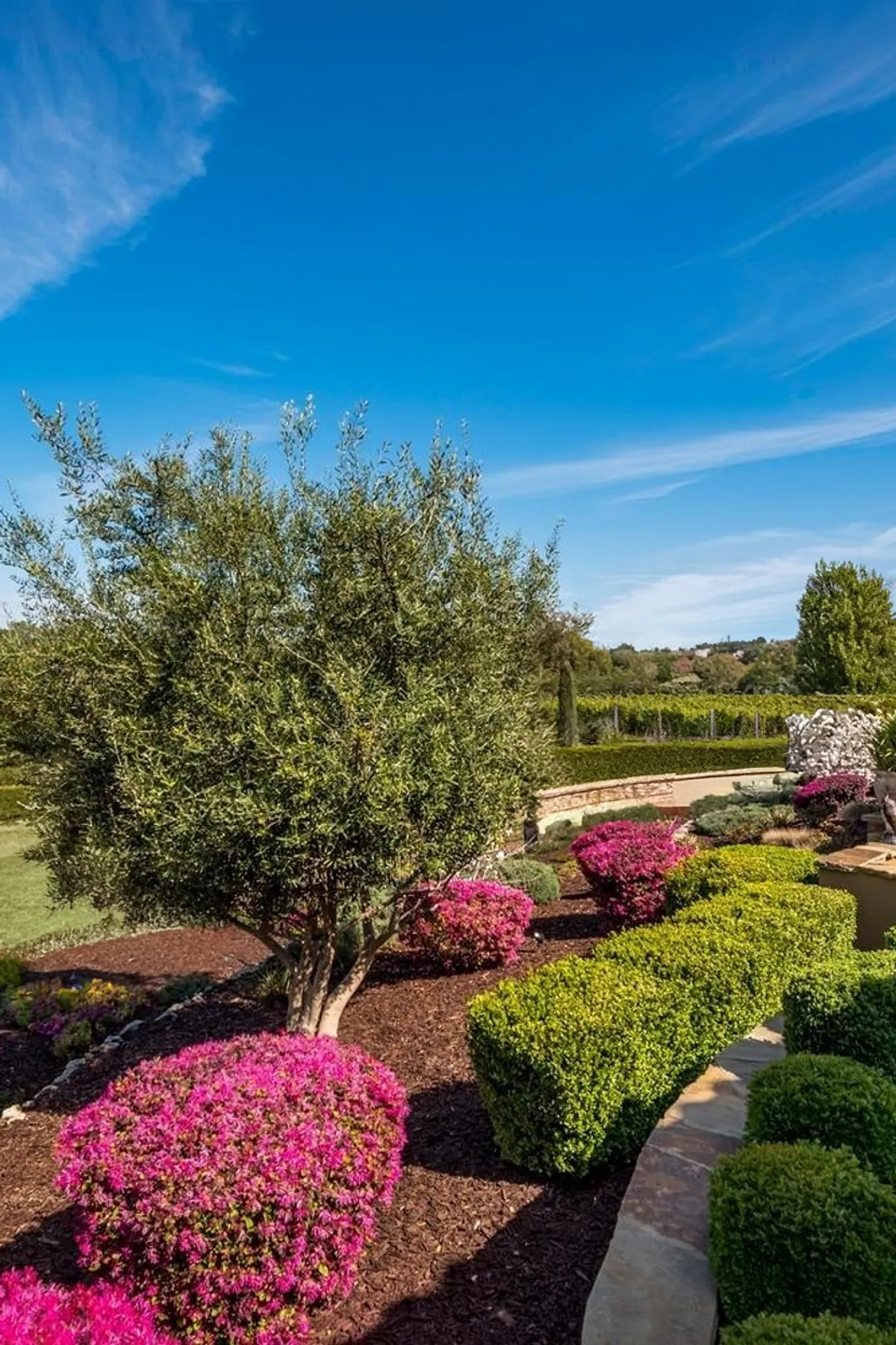 This landscape strikes a perfect balance between vibrant beauty and low-effort care. Flowering azalea bushes add bold pops of color, while evergreen varieties provide year-round structure and greenery—both requiring minimal upkeep once established. A layer of mulch keeps weeds down and soil moisture in, making watering less frequent and saving time. At the center, a mature olive tree adds Mediterranean charm and thrives in sunny, dry conditions with little attention. It’s a smart, stunning setup designed for beauty without the fuss.