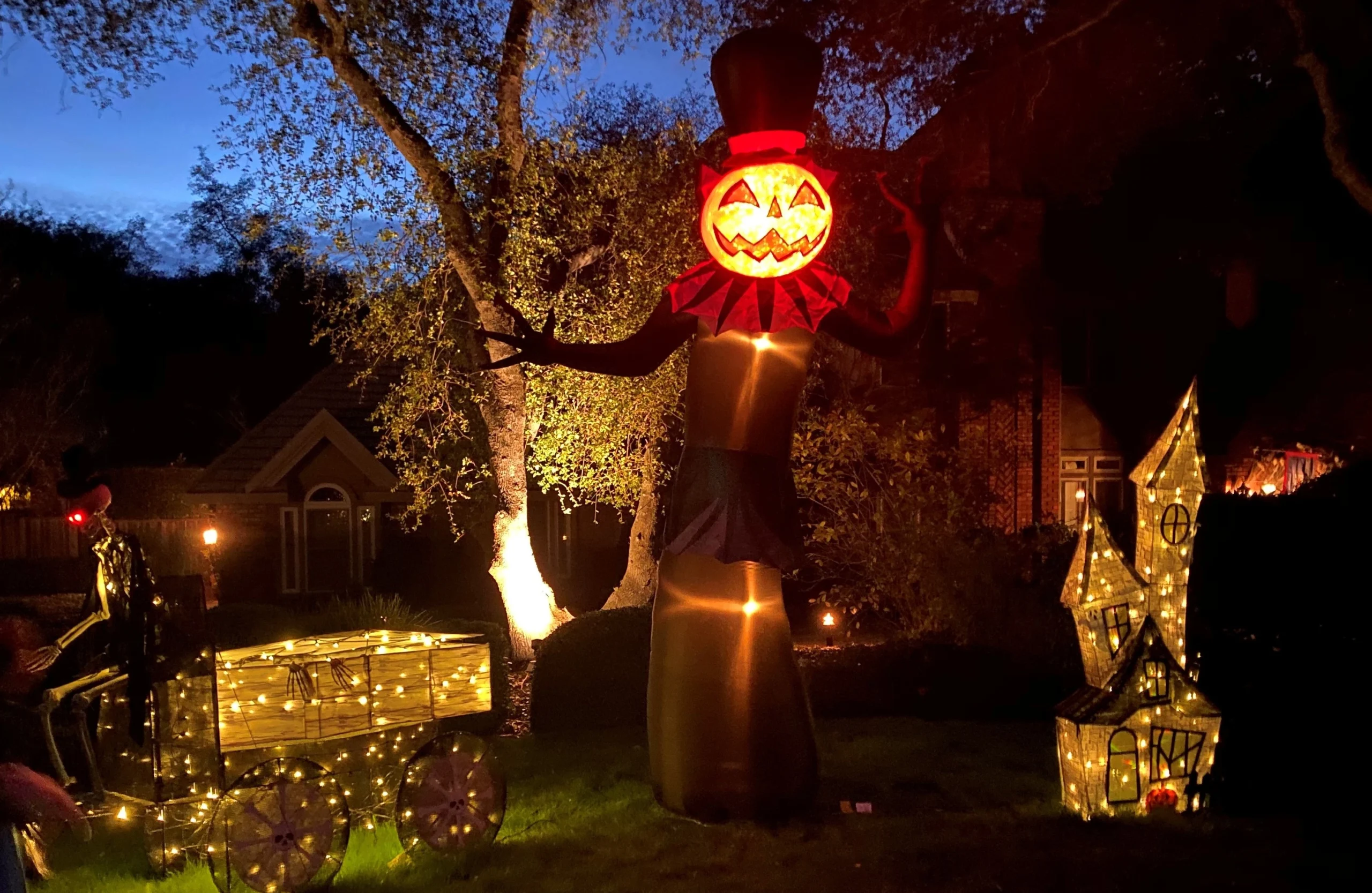 This isn’t your average yard display. The Pumpkin King’s holding court tonight, lighting up the neighborhood with that grin that says “run… or join the party.” 🎃